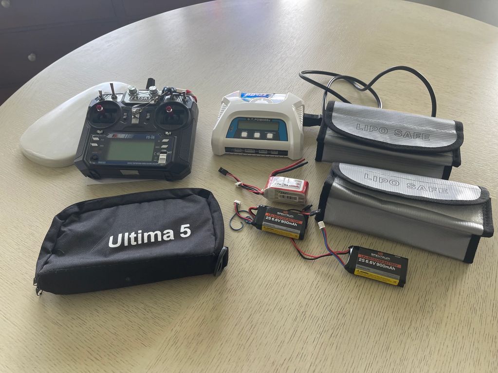 Soling #123 with wood folding stand, a Flysky F16 Transmitter, a LIPO/LiFe AC/DC Charger, 3 LiFe batteries, 2 LIPO Safe Battery Pouches, a small tool bag, and an extra hatch cover because you never know when you may need one.